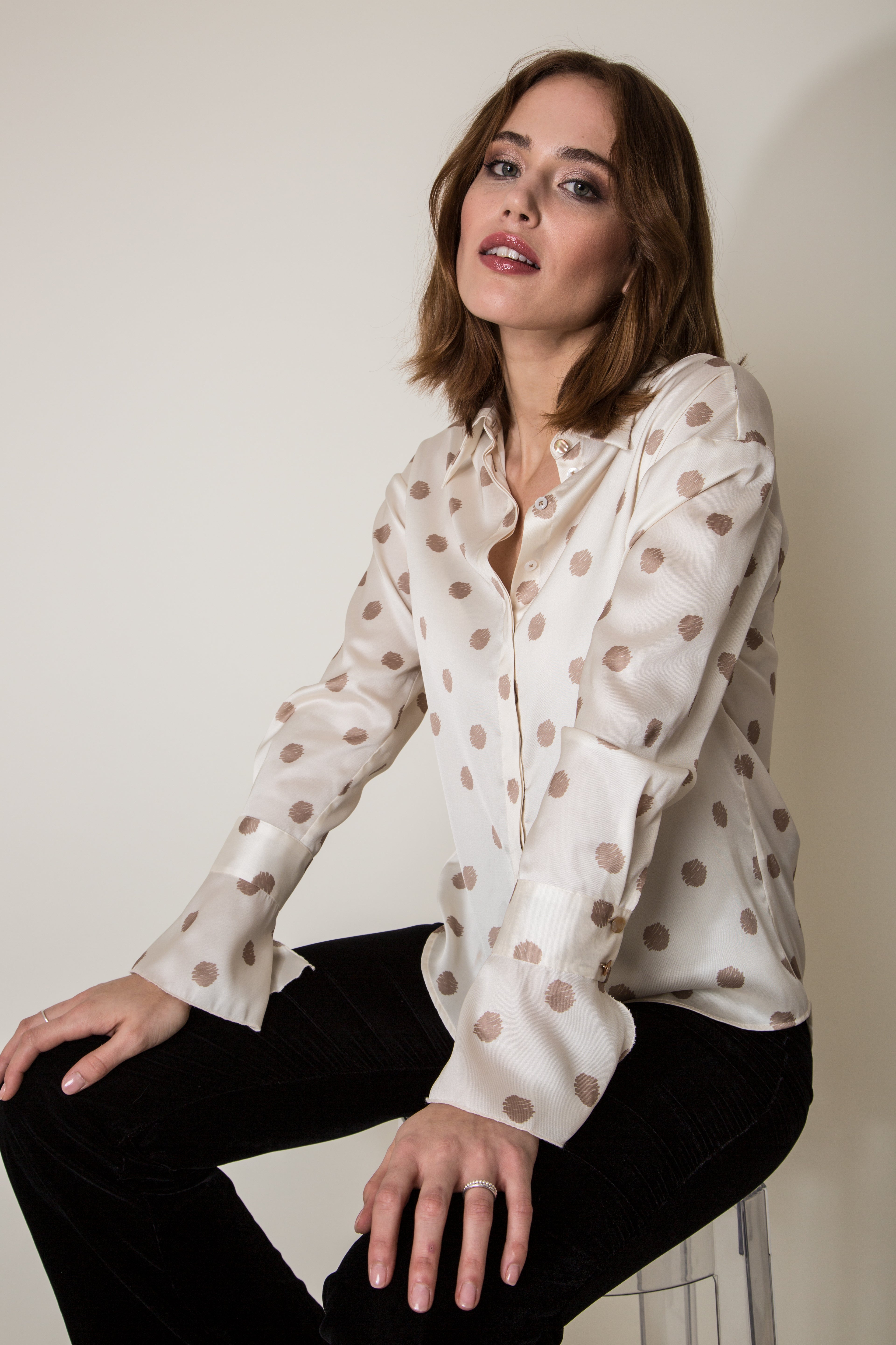The "Dahinda Points" blouse impresses with its loose silhouette, all-over dot pattern and ruffles on the cuffs. The flowing fabric ensures elegance, while the ruffles on the cuffs give the model romantic accents.