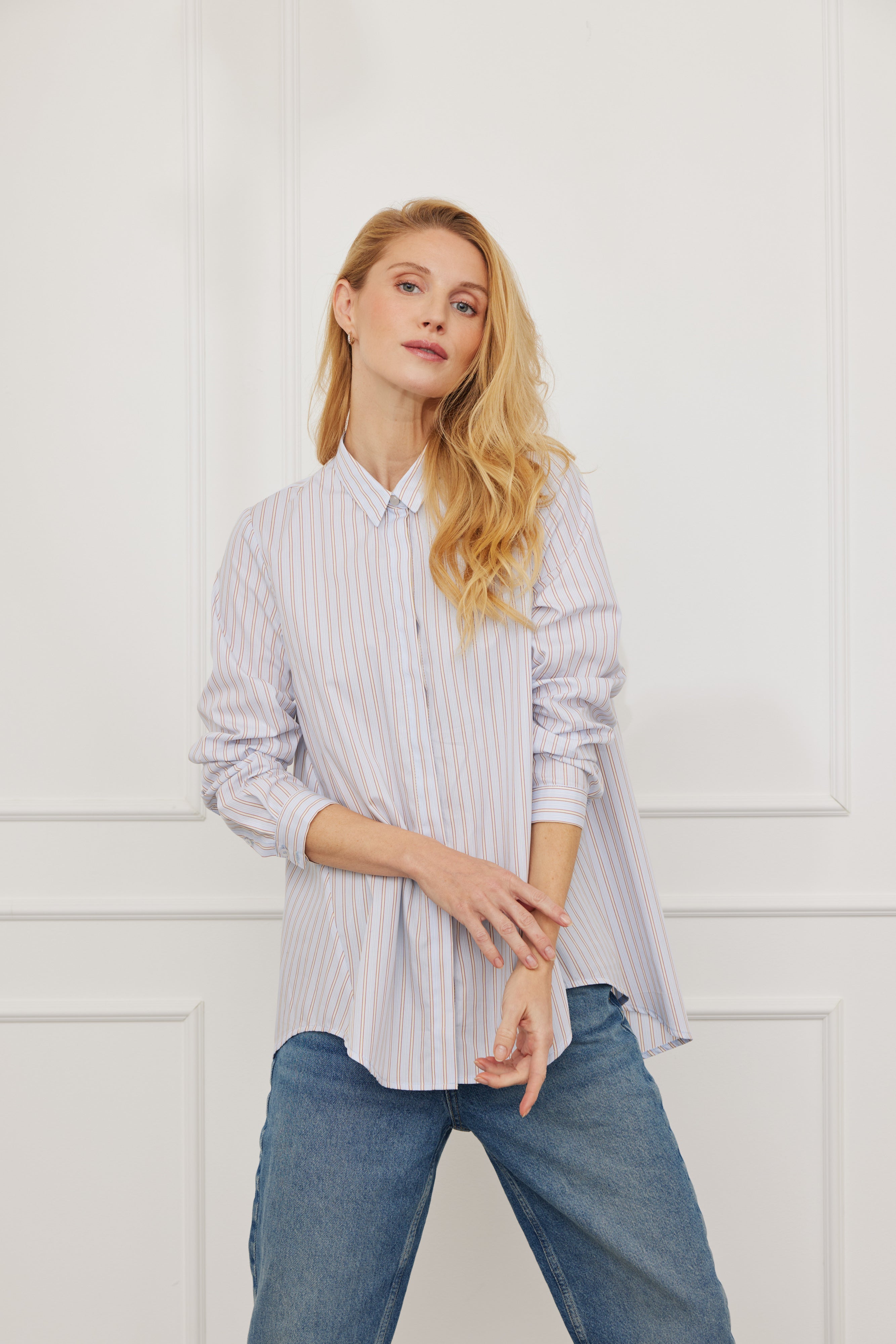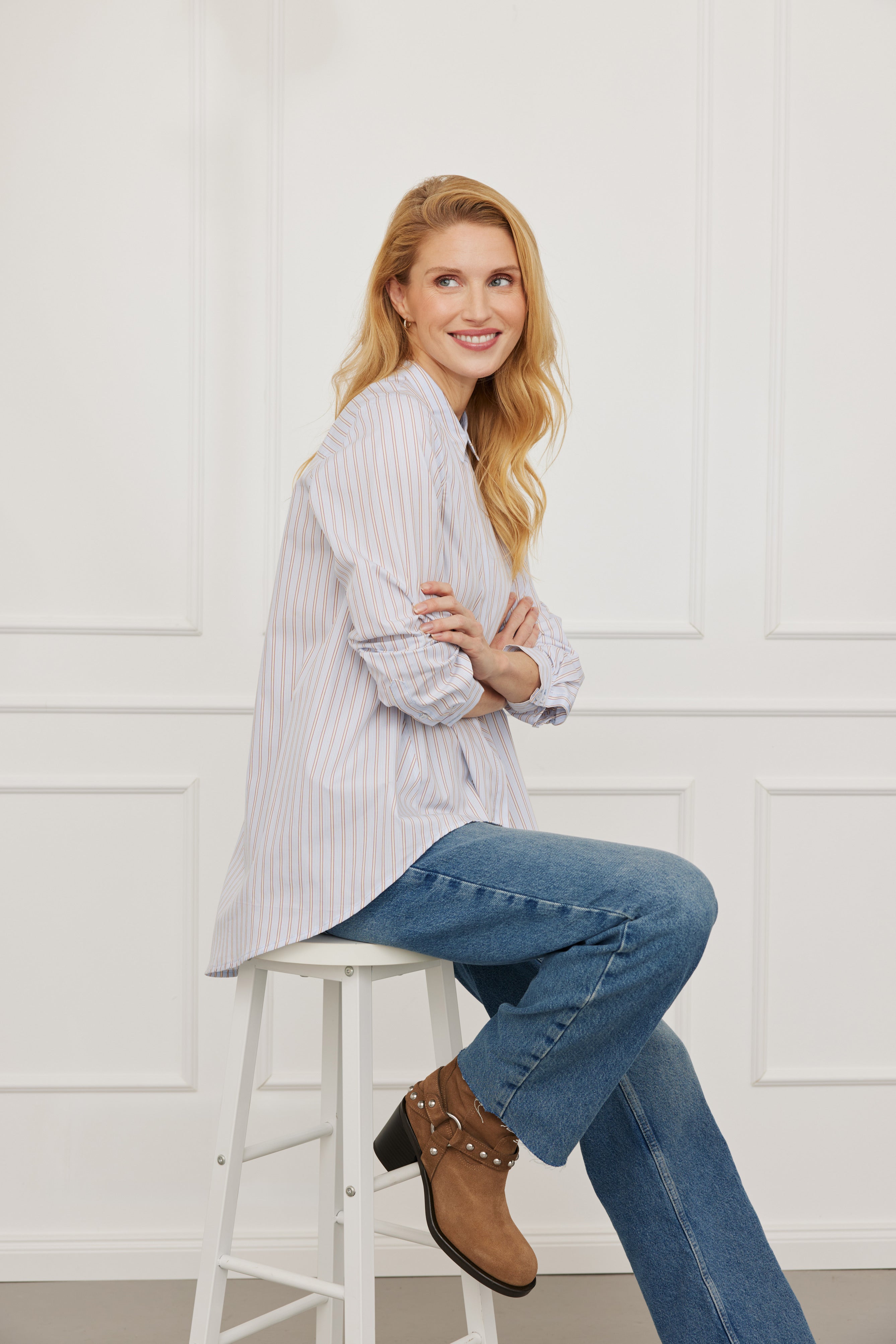 Die „Laax Stripes“ Bluse in Blau-Beige kombiniert lässigen Vokuhila-Schnitt mit zeitlosem Streifenmuster. Vorne kürzer, hinten länger – der lockere Schnitt umspielt sanft die Figur und sorgt für eine moderne, feminine Silhouette.