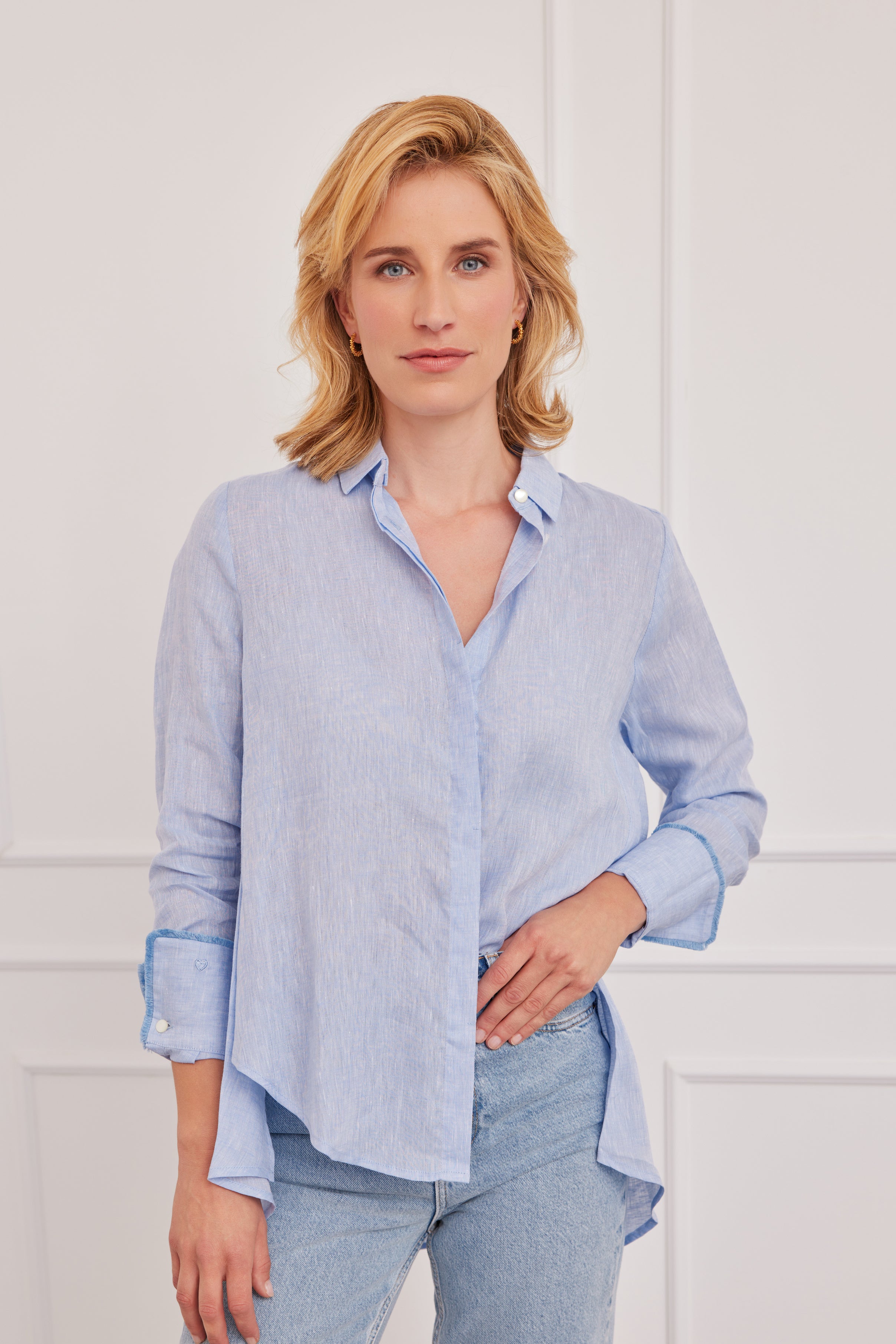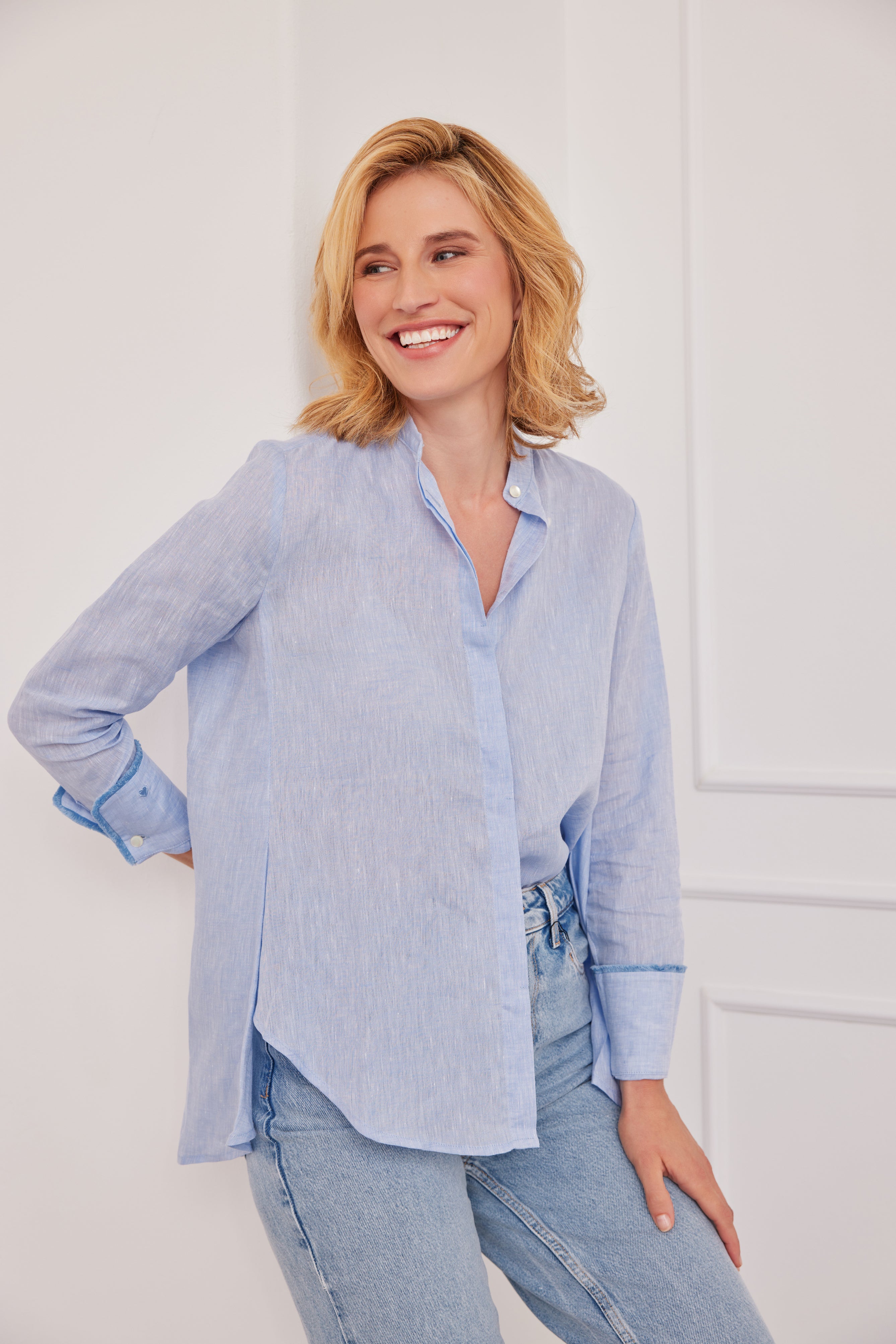 Made from 100% pure linen , it offers the highest level of comfort and impresses with its breathable and skin-friendly properties. The loose cut of the Mila Linen blouse flatters every figure and ensures a relaxed feel . The special highlight: the cut is short at the front and long at the back , making the blouse a real eye-catcher .