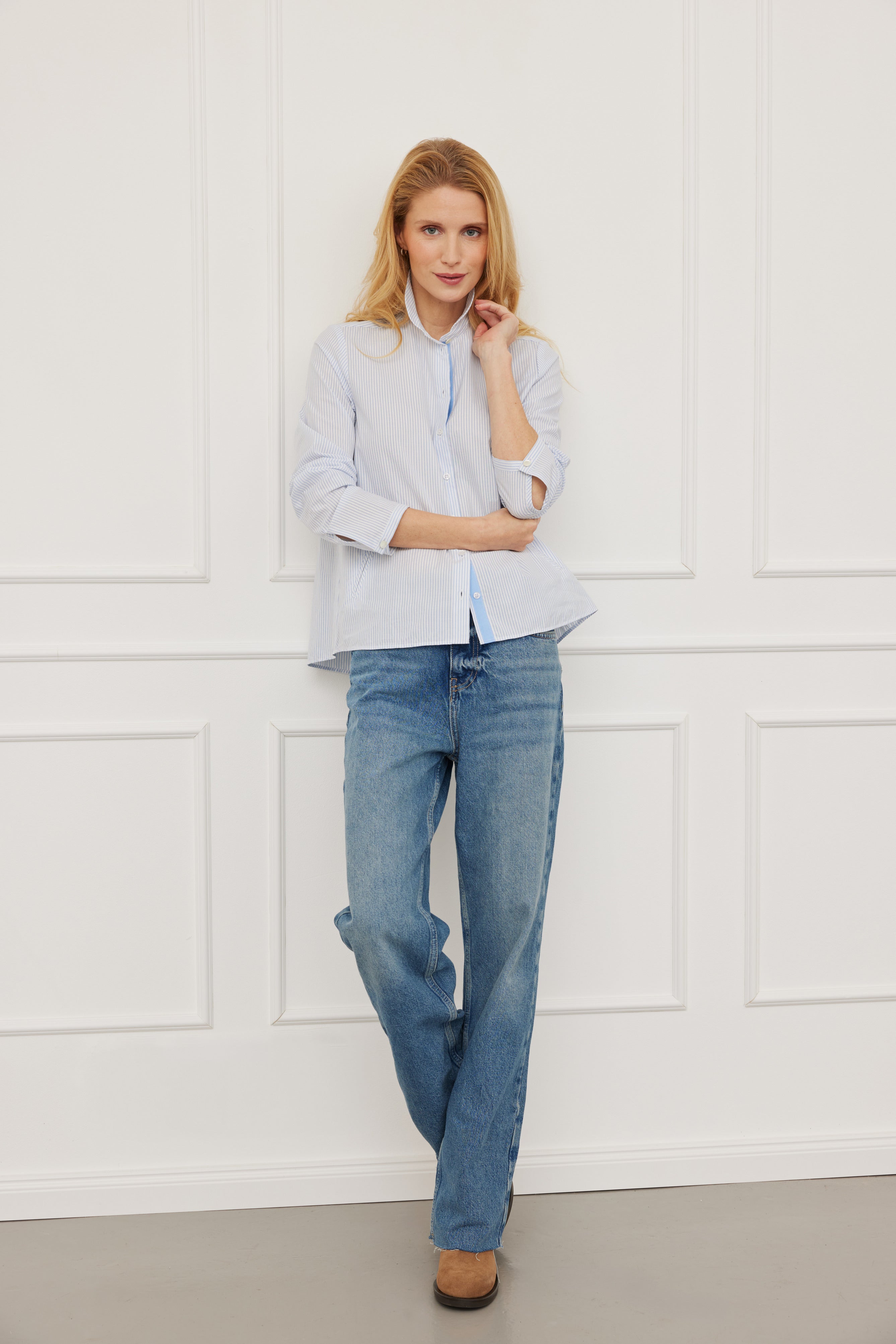 Dank leichtem Baumwollmix trägt sich die Bluse angenehm auf der Haut. Der lockere Schnitt sorgt für Bewegungsfreiheit, während das strukturierte Zierband entlang der Knopfleiste für einen stilvollen Akzent sorgt. Der abgerundete Saum verleiht der Bluse eine lässige Silhouette – perfekt für Office und Freizeit.
