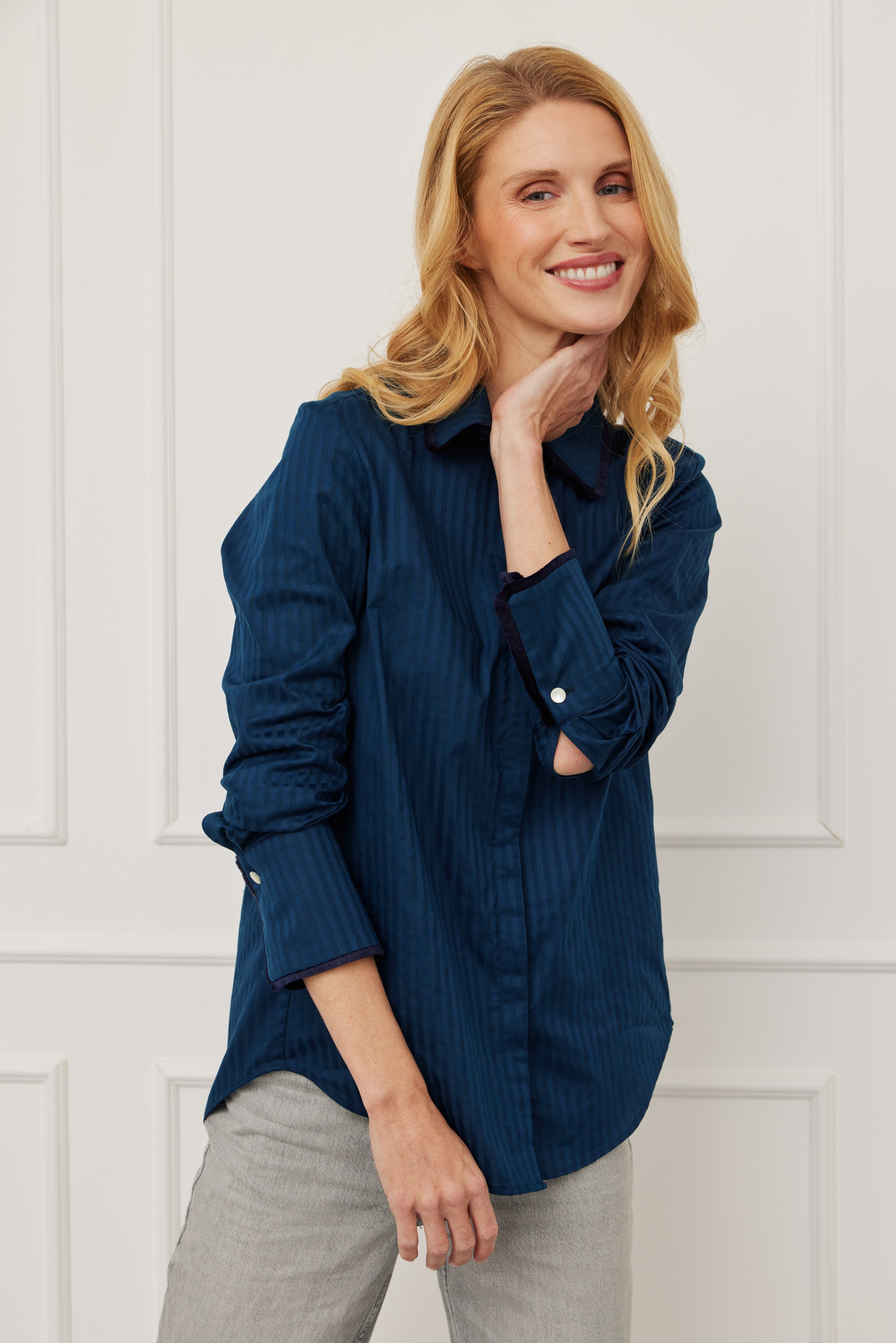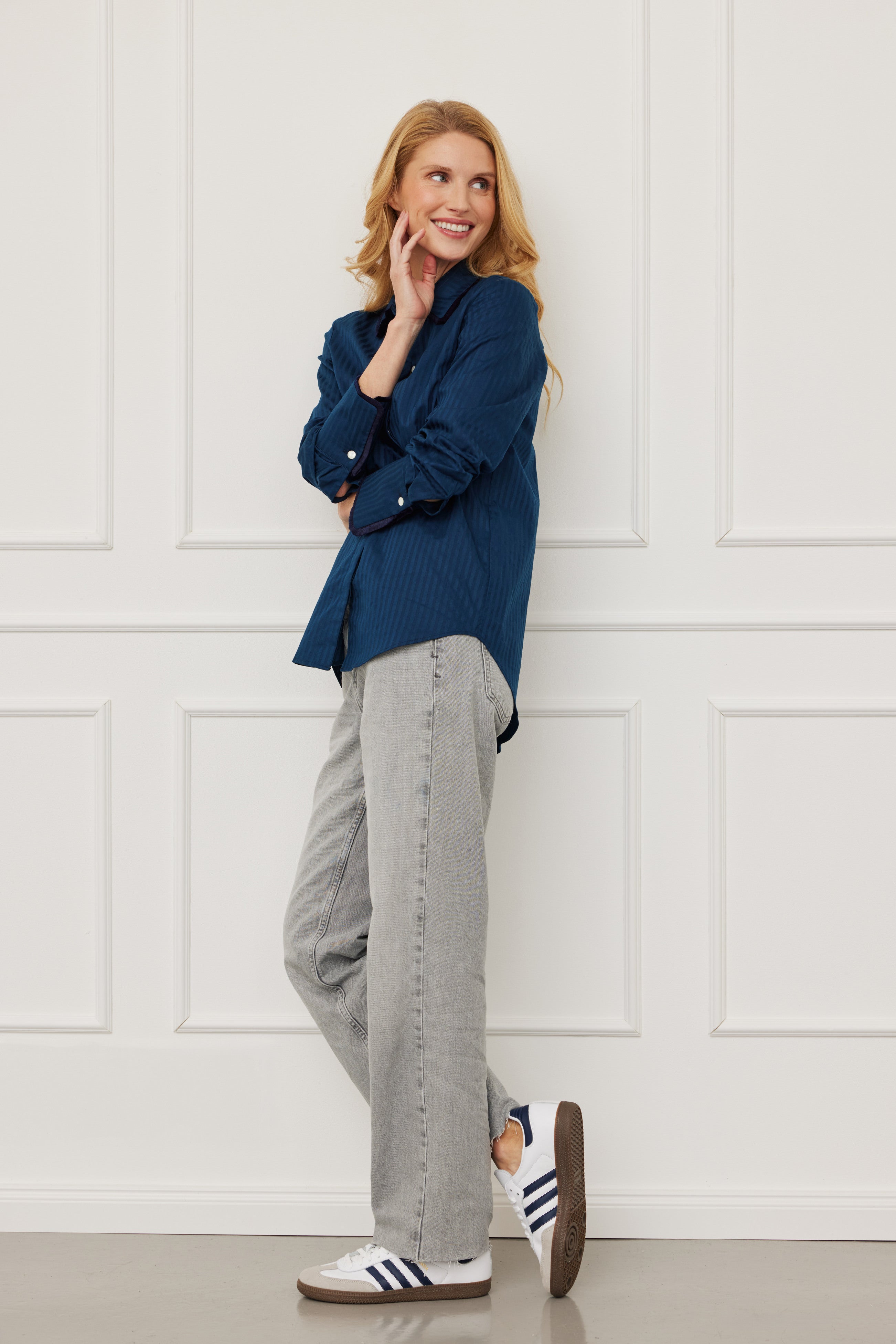 Bluse „Sunkissed“ – Stripes Navy | Sportlich-eleganter Winterklassiker mit edlen Details