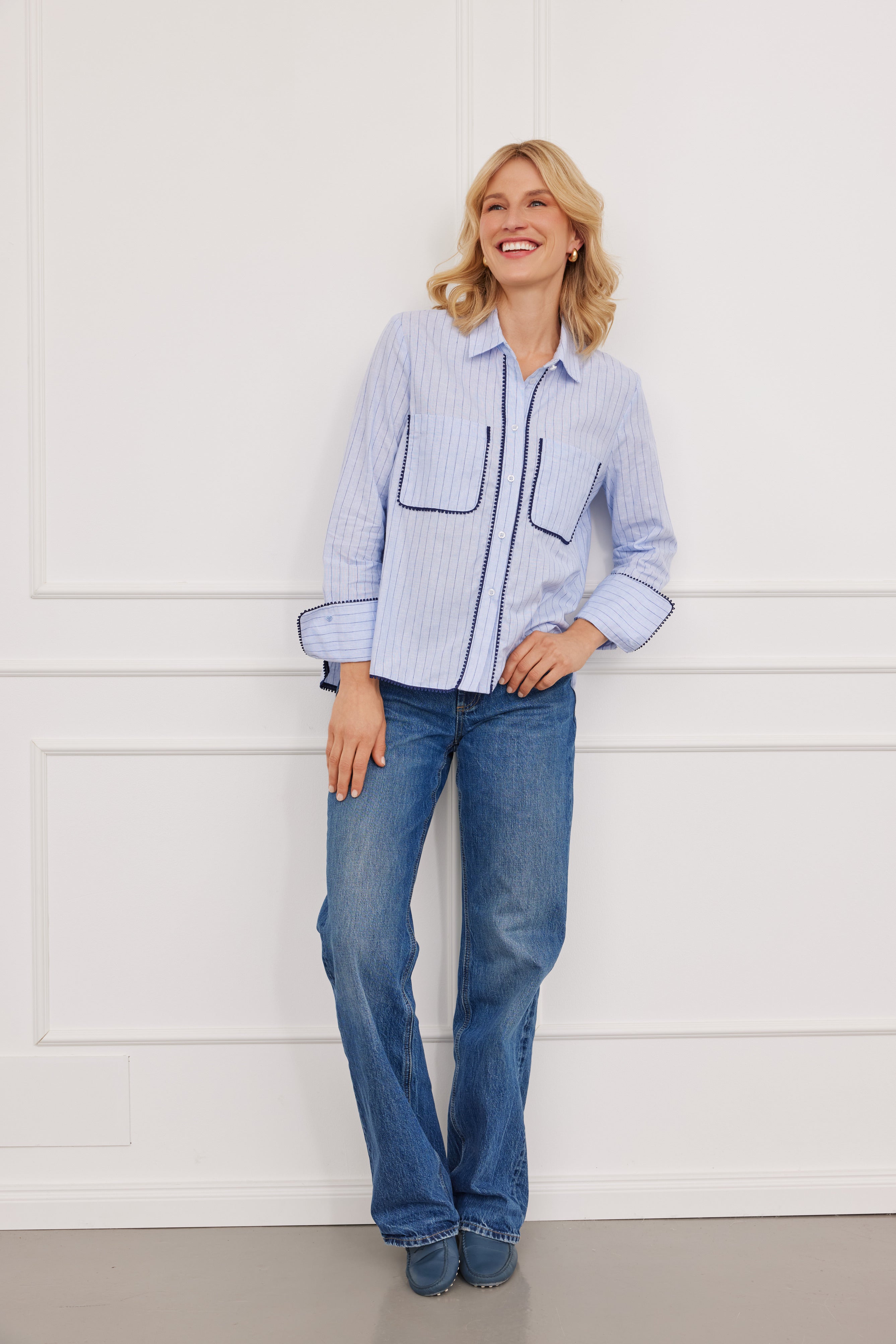 • Leichter Sommerlook: Kombinieren Sie die Emilia Stripes Bluse mit einer weißen Leinenhose und Sandalen – perfekt für entspannte Sommertage.