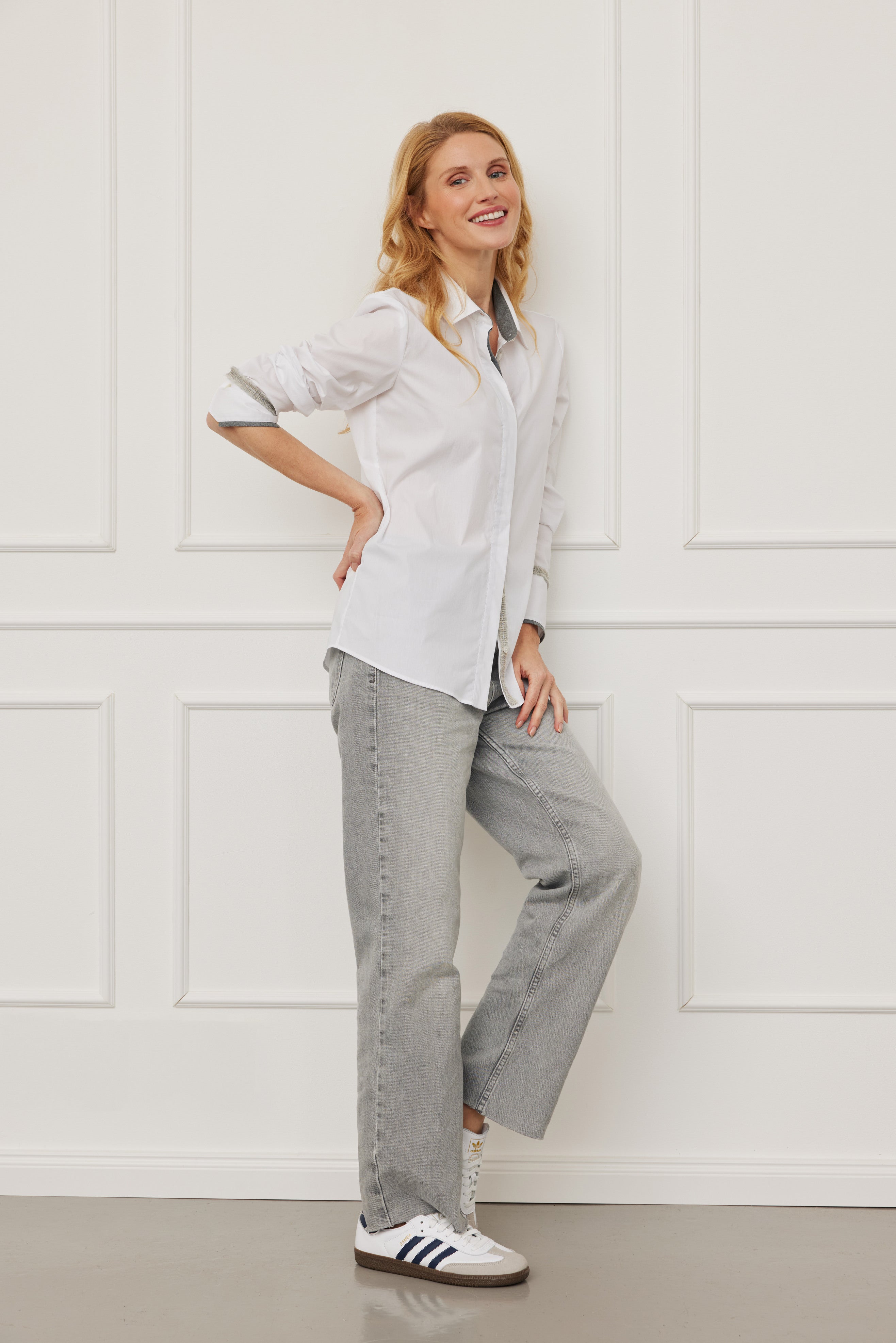 Die „Juna Mohair“ Bluse in Uni Weiß überzeugt durch klare Linien, hochwertige Materialien und liebevolle Details. Der dezente Twill-Kontraststoff (100 % Baumwolle) verleiht dem Design Struktur und Tiefe, während das graue Mohair-Zierband entlang der Knopfleiste einen edlen Akzent setzt.