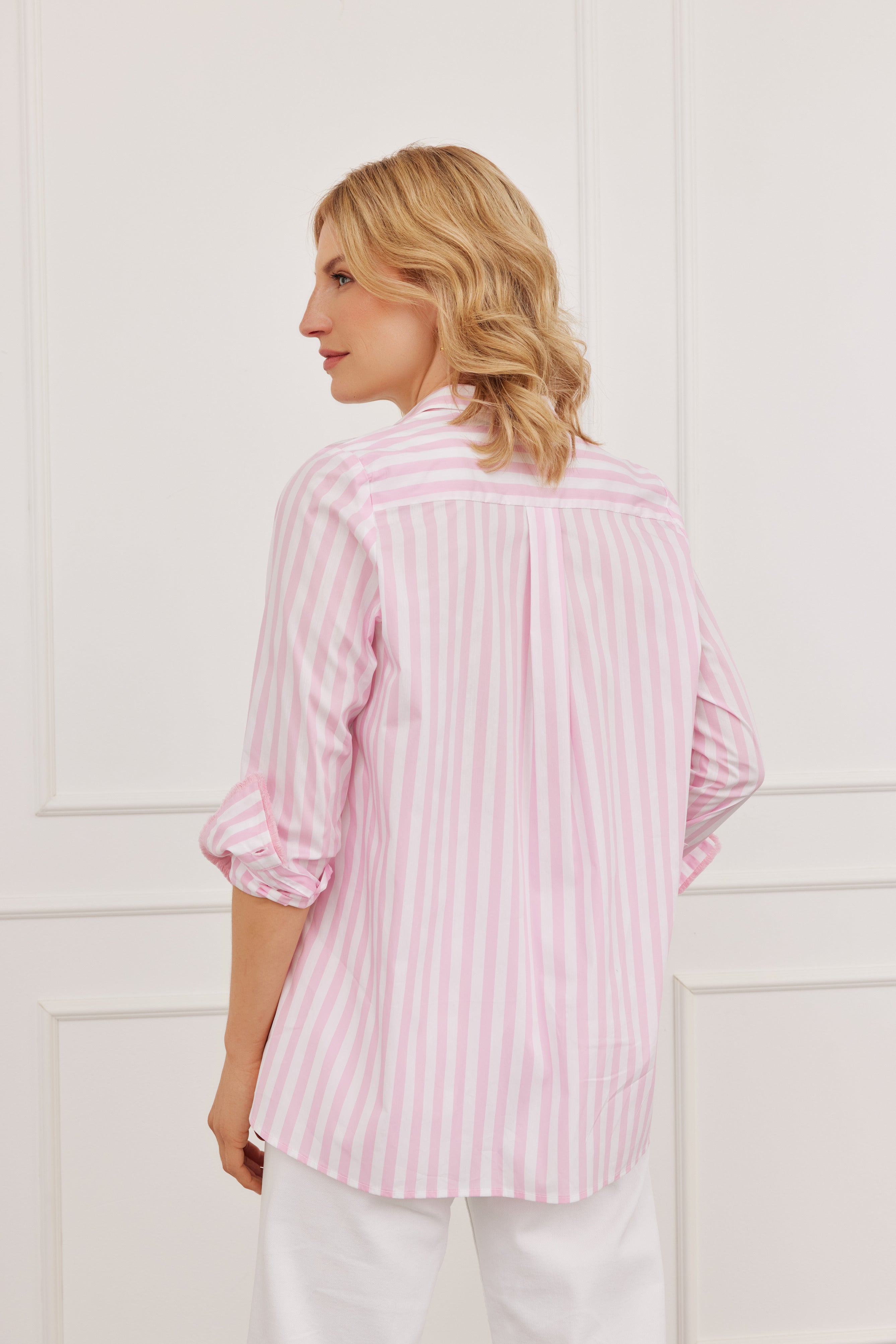 Bluse „Mila Stripes Rosa“ – Frischer Streifenlook mit modernem Vokuhila-Schnitt