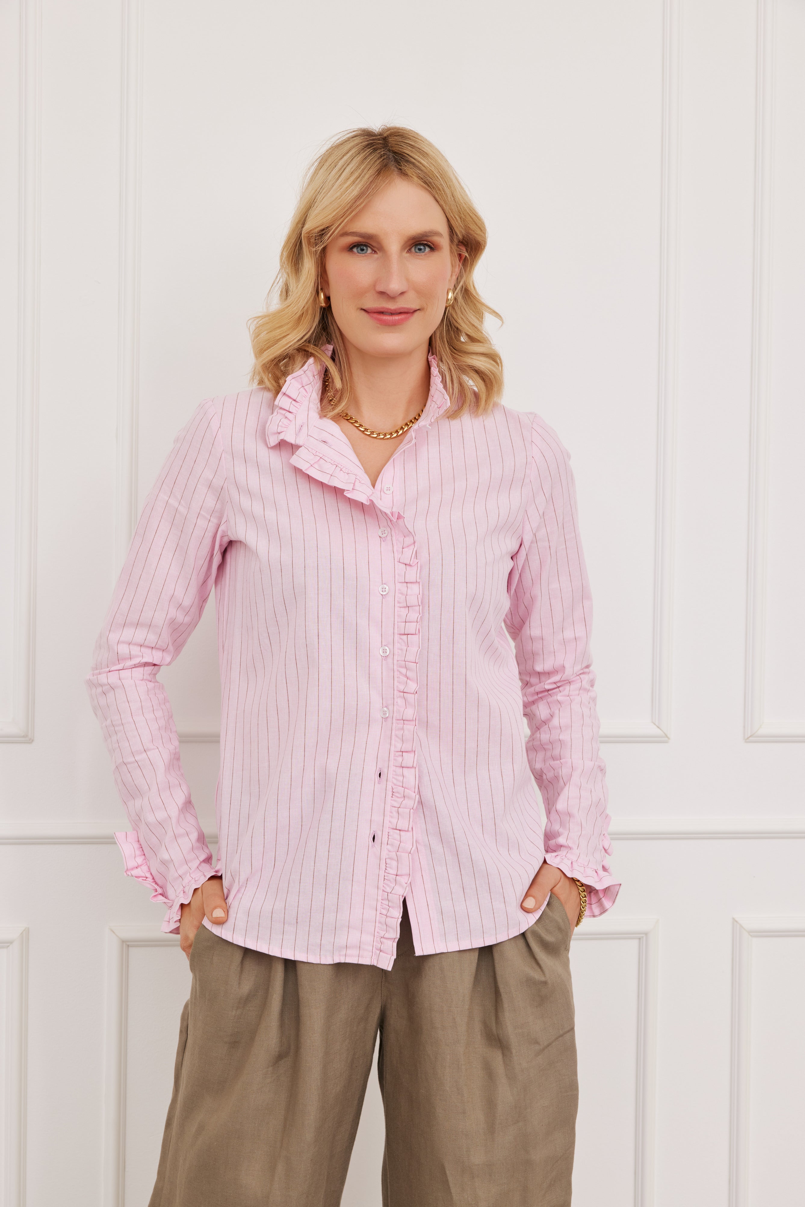 Die Bluse „Singaraja Stripes Rosa“ bringt frischen Wind in Ihre Garderobe. Mit ihrem klassischen Straight Fit und dem zarten Streifenmuster in Rosa und Weiß kombiniert sie zeitlose Eleganz mit femininer Leichtigkeit – perfekt für Alltag, Büro und Freizeit.