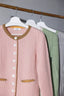Ein echtes Highlight sind die handgearbeiteten Kontrastdetails an Kragen und Saum sowie die farblich abgesetzten innenliegenden Taschen, die für charmante Akzente sorgen. Perlmuttknöpfe vollenden das stilvolle Design.